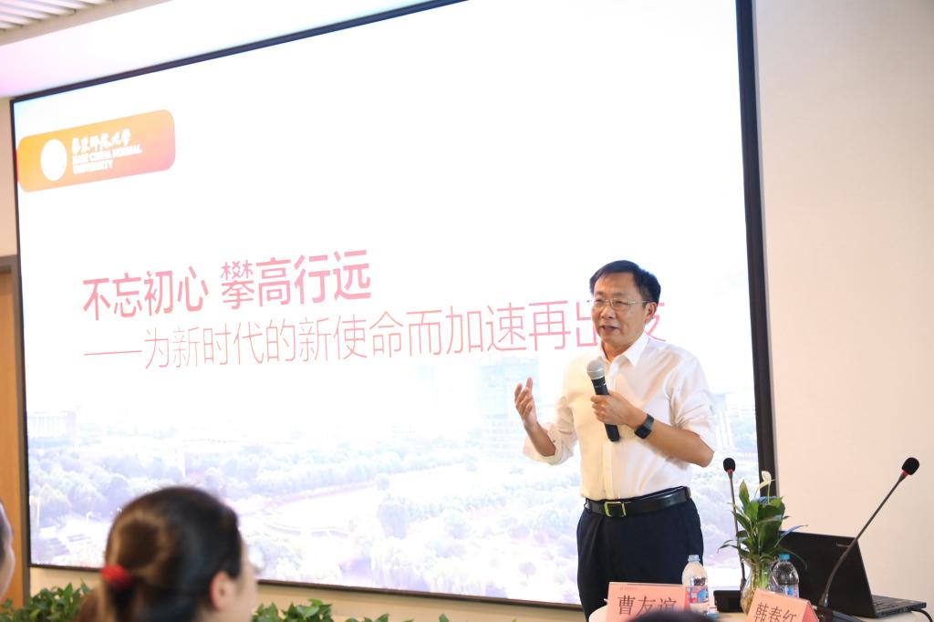 9月14日上午,校党委副书记、纪委书记曹友谊以“不忘初心,攀高行远——为新时代的新使命而加速再出发”为题,为中文系、哲学系的新生上课。曹友谊指出,华东师大是一所有“范”的大学,如今学校在教学科研、人才培养和国际交流等领域形成独特的优势,在中国乃至世界的舞台上展现出越来越强的影响力,正努力为新同学“学在师大”“乐在师大”“爱在师大”“梦在师大”铺就更宽更好的发展之路。曹友谊深情勉励新生要学习新知、认识社会、发展自我,将立德与勤学相结合、传承与创新相结合、梦想与理性相结合,努力成长为德智体美劳全面发展的社会主义建设者和接班人,实现自我人生价值的最大化增值。